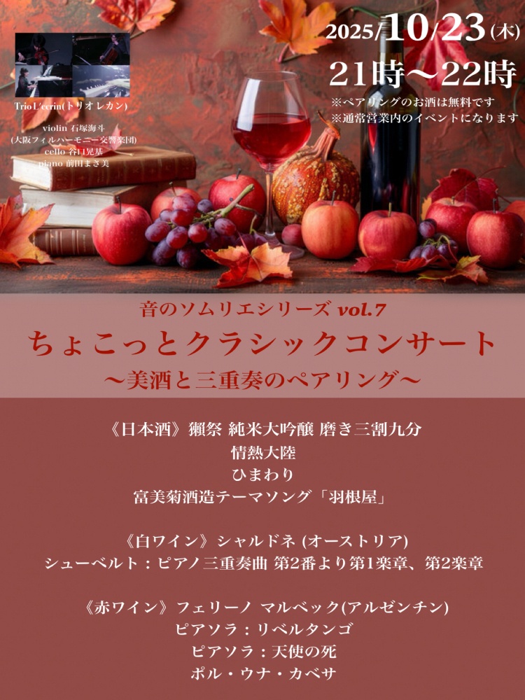 春にしたコンサートの秋バージョン。曲に合うお酒をご用意しました。ペアリングをお楽しみください。①情熱大陸など日本の音楽×獺祭磨き三割九分②シューベルト/ピアノ三重奏曲×シャルドネ(白)③ピアソラなどのタンゴ×マルベック(赤)